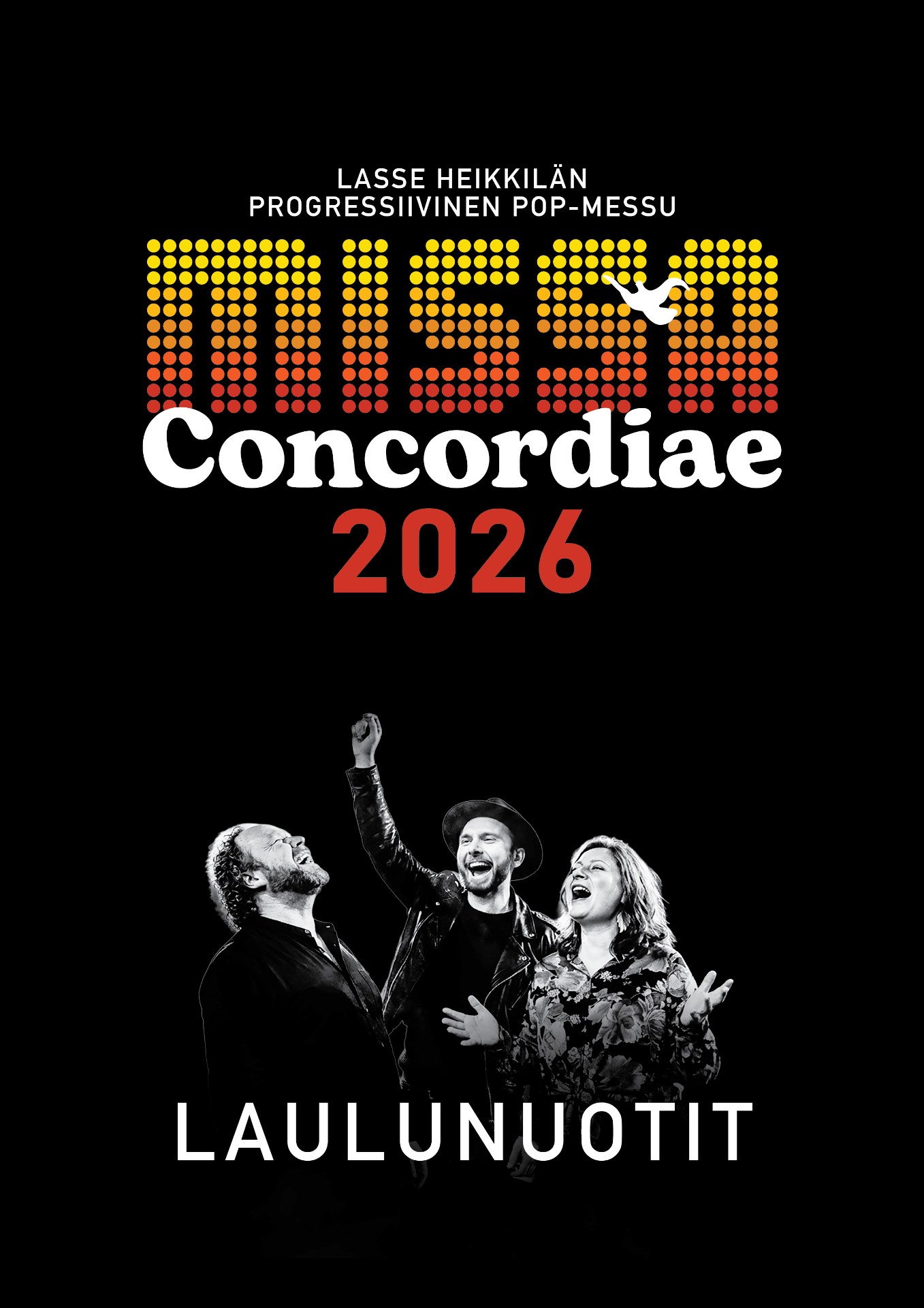 Missa Concordiae 2026 laulunuotit. 13 laulua. Solistit, kuoro. Sointumerkit. A4 kierreselkä. Suuremmista määristä (esim. kuoroille) alennus neuvoteltavissa. Ota yhteyttä yhteydenottolomakkeella sivun alapalkista.